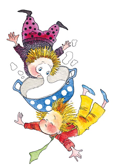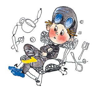 Незнайка тоже не удержался на месте и, полетев в противоположную сторону, стукнулся головой о кастрюлю с кашей. От толчка жидкая манная каша выплеснулась прямо в лицо находившемуся неподалёку Пончику.