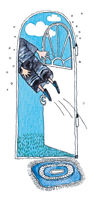 Винтик освободился от прибитых к полу ботинок, оттолкнулся ногой от стола и со скоростью шмеля полетел из кухни. Для того чтоб попасть в мастерскую, ему нужно было выйти во двор. Вылетев из кухни, он принялся пробираться по коридору, отталкиваясь руками и ногами от стен и от всего, что могло встретиться на пути. Наконец он добрался до выходной двери и попытался её открыть. Дверь, однако, была закрыта плотно, и попытки Винтика долго не приводили к успеху: когда Винтик толкал дверь вперёд, реактивная сила незаметно отбрасывала его назад, и ему приходилось затрачивать много усилий, чтобы снова добраться до двери.