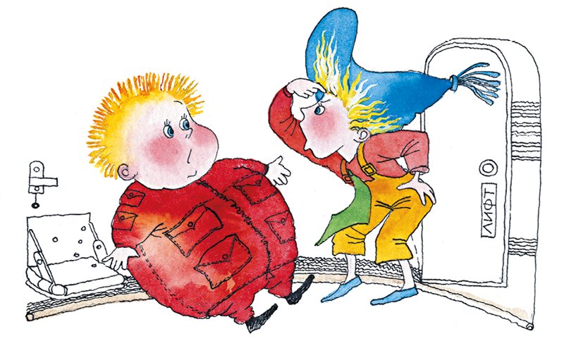 Незнайка выбрался из отсека и, отворив дверцу лифта, увидел в кабине Пончика.
