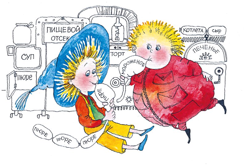 Вернувшись в пищевой отсек, друзья открыли термостат, в котором хранились горячие космические котлеты, космический кисель, космическое картофельное пюре и другие космические блюда. Все эти блюда назывались космическими потому, что были помещены в длинные целлофановые трубочки, на манер ливерной колбасы. Приставив конец такой трубочки ко рту и сдавливая её в руках, можно было добиться, чтобы пища попадала из трубочки прямо в рот, что было очень удобно в условиях невесомости. Уничтожив по нескольку таких трубочек, друзья закусили космическим мороженым, которое оказалось на редкость вкусным. У этого космического мороженого был лишь один недостаток: от него страшно мёрзли руки, так как всё время приходилось сжимать холодную целлофановую трубочку в руках – иначе мороженое не могло попасть в рот.