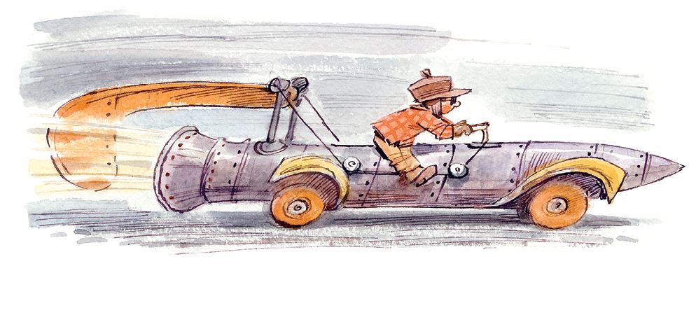 Ещё здесь можно было увидеть так называемые реактивные роликовые труболёты. Эта машина представляет собой длинную трубу на четырёх роликах. Труба наполняется реактивным топливом. Топливо сгорает внутри, и сгоревшие газы выбрасываются через хвостовую часть трубы, благодаря чему труба катится вперёд на роликах. Поворот осуществляется при помощи руля, который имеется сзади. Вырывающиеся из хвостовой части горячие газы ударяют в плоскость руля, и труболёт поворачивает куда надо. Эти труболёты не очень удобны для езды летом, потому что сидеть приходится верхом на трубе, которая при быстром движении сильно нагревается; зато зимой эта машина просто незаменима, так как вместо имеющихся внизу роликов ставятся полозья, и труболёт развивает такую головокружительную скорость, что даже перелетает через небольшие овраги; к тому же на нём сидишь, как на тёплой печке, что особенно приятно в большой мороз.