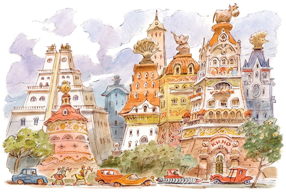 Он свернул к тротуару и остановил машину. Друзья вылезли из неё и зашагали по улице, глядя по сторонам. А вокруг было на что посмотреть. По обеим сторонам улицы стояли многоэтажные дома, которые поражали своей красотой. Стены домов были украшены затейливыми узорами, а наверху под крышами были большие картины, нарисованные яркими, разноцветными красками. На многих домах стояли фигуры различных зверей, вытесанные из камня. Такие же фигуры были внизу, у подъездов домов.