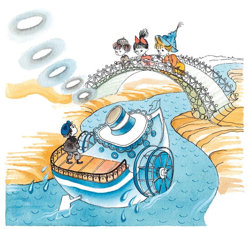 Неожиданно мост окутался клубами дыма, который вырывался из пароходной трубы. Незнайка закашлялся, задыхаясь в дыму, но всё-таки побежал на другую сторону моста, чтоб посмотреть вслед пароходу. Кнопочка и Пёстренький побежали за ним. Когда дым рассеялся, пароход уже был далеко.