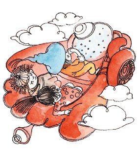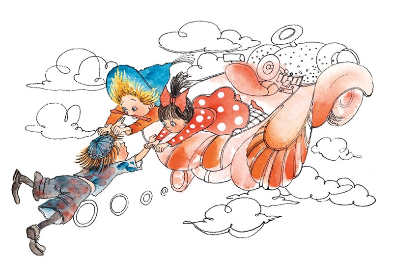 И сейчас же у автомобиля появились маленькие крылья, и он полетел над землёй, поднимаясь всё выше и выше. В то же время сзади послышался крик. Незнайка оглянулся и увидел, что Пёстренький вывалился из машины и болтался позади в воздухе, уцепившись руками за буфер. Взяв в зубы волшебную палочку, Незнайка перелез через спинку переднего сиденья и, схватив Пёстренького за курточку, пытался втащить его обратно в машину. Но это оказалось ему не под силу, так как тащить можно было одной рукой, а другой рукой приходилось держаться за кузов машины. Увидев, что Пёстренький теряет последние силы, Незнайка хотел сказать Кнопочке: «Возьми у меня изо рта палочку и скажи, чтоб машина спустилась вниз». Но так как у него в зубах была палочка, то вместо этих слов получилось: