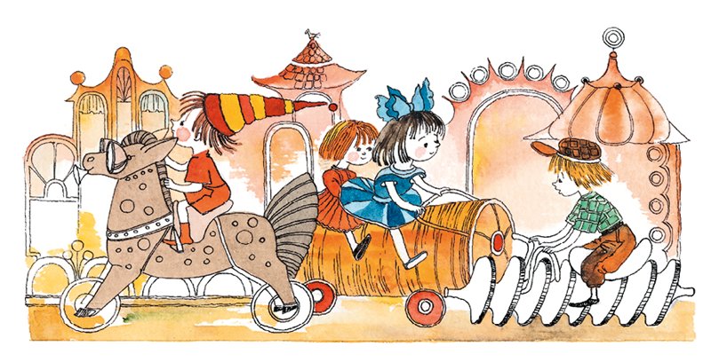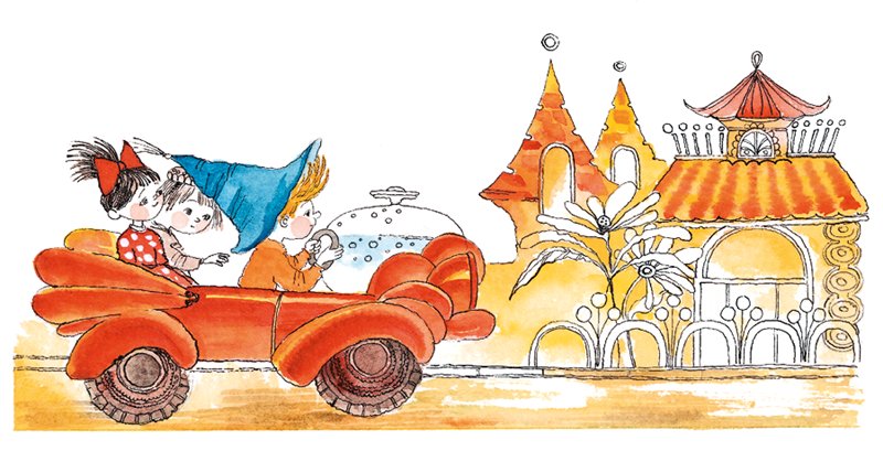 Чем дальше ехали путешественники, тем чаще попадались дома. Шоссе незаметным образом превратилось в широкую городскую улицу. Дома по сторонам становились всё выше. Всё больше появлялось коротышек на тротуарах и автомобилей на мостовой. Скоро машины двигались по улице непрерывным потоком, мешая друг другу и останавливаясь на перекрёстках. Здесь были такие машины, которые Незнайка и его спутники уже видели, но были и такие, с которыми они встретились в первый раз. Особенно много было автомобилей, напоминавших по своей форме игрушечные деревянные лошадки. Эти автолошадки были на четырёх ножках, оканчивающихся внизу роликами. Ездили на них сидя верхом, сунув в стремена ноги и держась руками за уши. Вместо глаз у них были фары, то есть осветительные фонари, а вместо рта – сигнальная труба, чтоб пугать зазевавшихся пешеходов. На таких автолошадках ездили по одному и по двое – один впереди, другой сзади, но были и четырёхместные, то есть такие, в которых две лошадки ставились рядом и соединялись попарно.