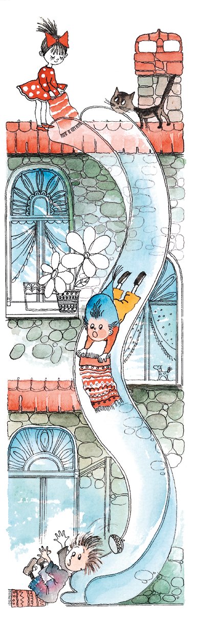 Удачнее всех скатилась Кнопочка. Она аккуратно уселась посреди коврика и, когда ехала вниз, не хваталась руками за стенки. Поэтому у неё всё получилось как нельзя лучше.