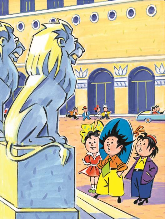 Он свернул к тротуару и остановил машину. Друзья вылезли из неё и зашагали по улице, глядя по сторонам. А вокруг было на что посмотреть. По обеим сторонам улицы стояли многоэтажные дома, которые поражали своей красотой. Стены домов были украшены затейливыми узорами, а наверху под крышами были большие картины, нарисованные яркими, разноцветными красками. На многих домах стояли фигуры различных зверей, вытесанные из камня. Такие же фигуры были внизу, у подъездов домов.