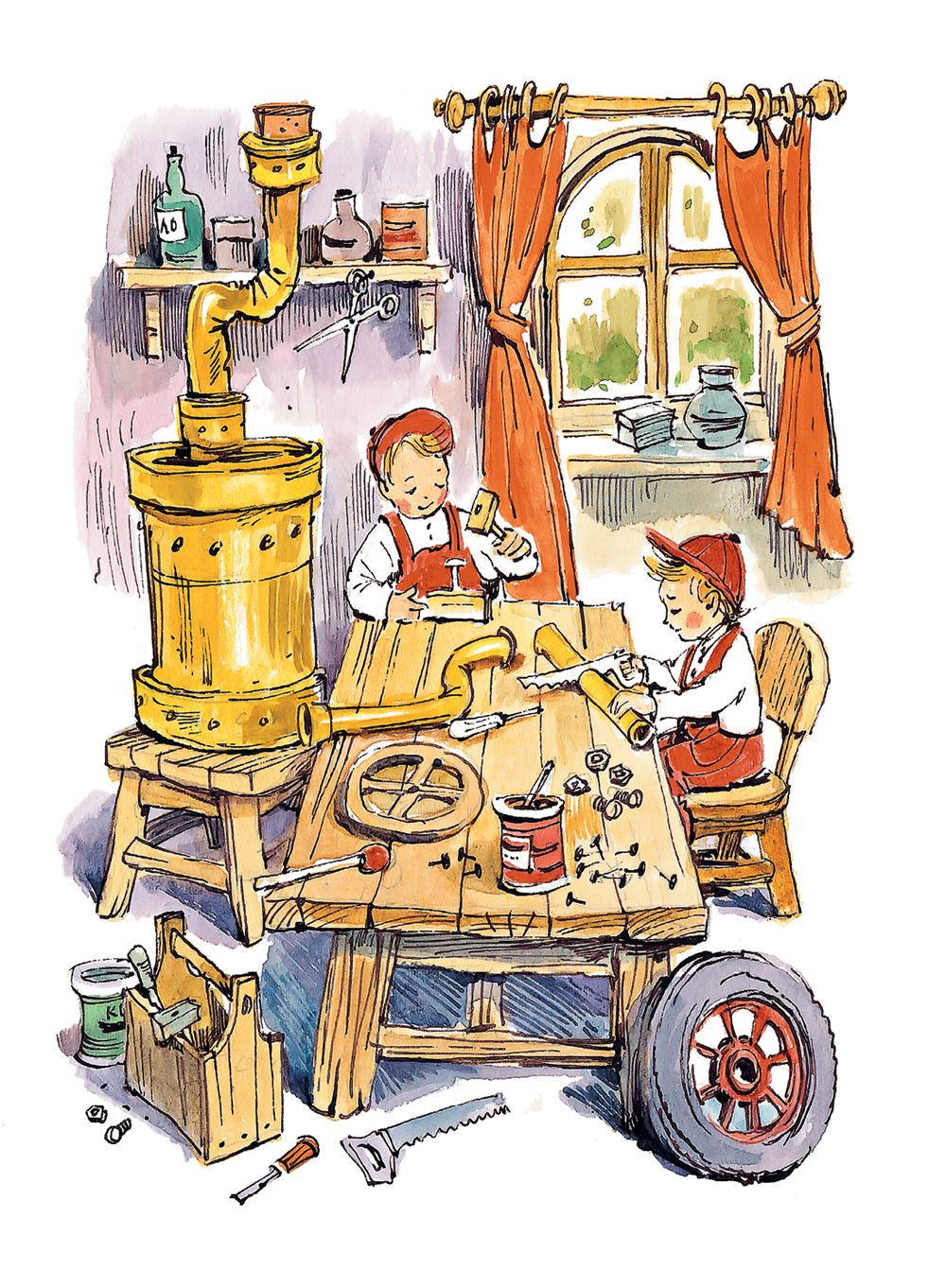 Винтик и Шпунтик по целым дням сидели у себя в мастерской и чинили примусы, кастрюли, чайники, сковородки, а когда нечего было чинить, делали трёхколёсные велосипеды и самокаты для коротышек.