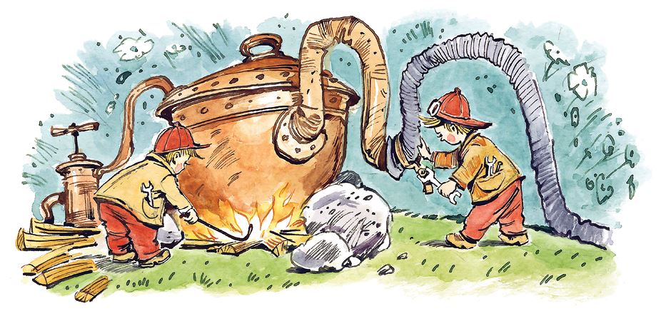 Пока вокруг спорили, Знайка велел развести посреди двора костёр, и все увидели, как Винтик и Шпунтик вынесли из своей мастерской большой медный котёл и поставили его на костёр. Этот котёл Винтик и Шпунтик уже давно сделали для нагревания воздуха. Котёл был с наглухо закрытой крышкой, в которой имелось отверстие. Сбоку был приделан насос для накачивания в котёл воздуха. Этот воздух нагревался в котле и уже горячий выходил через верхнее отверстие в крышке.