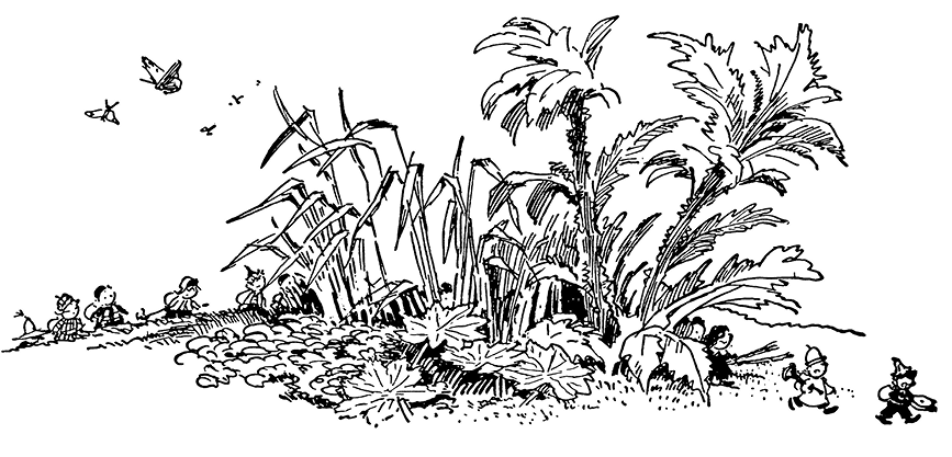 На другой день Знайка и его товарищи выступили в поход. Решено было путешествовать пешком. Воздушный шар лопнул, и его трудно было починить, да к тому же и не было попутного ветра. Впереди всех шёл Знайка с компасом в руках, за ним доктор Пилюлькин, потом Винтик и Шпунтик, а за ними остальные малыши-коротыши. Незнайка шёл позади всех.