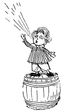 Цветика подхватили под руки и помогли ему взобраться на бочку. Цветик на минутку задумался, покашлял немножко, потом протянул к Знайке и его товарищам руку и с чувством прочитал стихи, которые сочинил тут же, стоя на бочке: