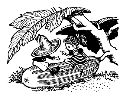 Однажды Незнайка встретился с Кнопочкой на берегу реки. Они уселись на большом зелёном огурце, которые во множестве росли вокруг. Солнышко уже поднялось высоко и как следует пригревало землю, но Незнайке и Кнопочке не было жарко, потому что огурец, на котором они сидели, словно на лавочке, был довольно прохладный, а сверху их защищали от солнца широкие огуречные листья, раскинувшиеся над ними, как огромные зелёные зонтики. Ветерок тихо шуршал в траве и поднимал на реке лёгкую рябь, которая так и сверкала на солнышке. Тысячи солнечных зайчиков, отразившись от поверхности воды, плясали на огуречных листьях, освещая их снизу каким-то таинственным светом. От этого казалось, что воздух под листьями, где сидели Незнайка и Кнопочка, тоже волнуется и трепещет, словно машет бесчисленными невидимыми крылышками, и всё это выглядело каким-то необычным, волшебным. Но Незнайка и Кнопочка не замечали никакого волшебства вокруг, так как вся эта картина была для них слишком привычна, да к тому же каждый из них был занят своими мыслями. Кнопочке очень хотелось поговорить о сказках, но Незнайка почему-то упорно молчал, и лицо у него было такое кислое и сердитое, что она даже боялась заговорить с ним.