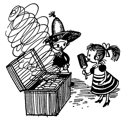– Ну, довольно дуться, это невежливо, – сказала Кнопочка. – Там у тебя рядом мороженое в голубом ящике.
