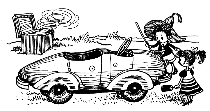 Сейчас же в конце улицы показался автомобиль и быстро подъехал к Незнайке и Кнопочке. Незнайке даже показалось, что это снова Винтик и Шпунтик едут. Однако, когда автомобиль остановился, Незнайка увидел, что за рулём никого не было.
