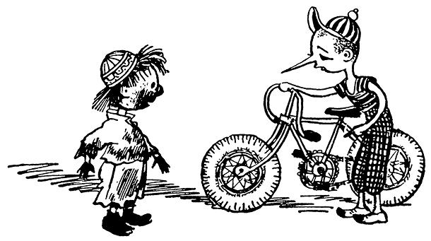 Приехав в Цветочный город, он всюду колесил на своём велосипеде, всюду совал свой длинный нос и со всеми знакомился. Скоро он знал всех наперечёт и не знал только Пачкулю, которого жители нарочно прятали, потому что боялись, как бы он не опозорил их.