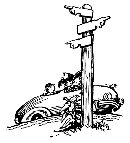 Беседуя таким образом, Незнайка и его спутники мчались всё дальше и не заметили, как домчались до перекрёстка дорог. Здесь Незнайка остановил машину, чтобы выяснить, куда ехать дальше: прямо, направо или налево. У перекрёстка стоял столб, а на нём были три стрелки с надписями. На стрелке, которая показывала прямо, было написано: «Каменный город». На стрелке, которая показывала налево, было написано: «Земляной город». И наконец, на стрелке, которая показывала направо, – «Солнечный город».