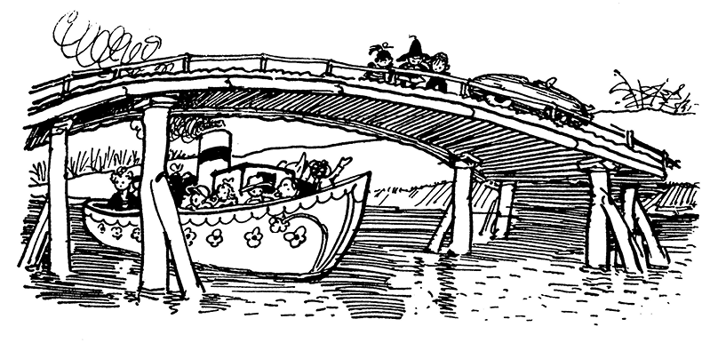 Въехав на середину моста, Незнайка остановил машину. Все вылезли и, облокотившись о перила моста, стали глядеть. На пароходной палубе находилось множество пассажиров-коротышек. Одни из них сидели на лавочках вдоль бортов и любовались красивыми берегами, другие беседовали между собой и даже о чём-то спорили, третьи прохаживались. Были ещё и такие, которые мирно дремали, расположившись в мягких креслах с откидными спинками. В этих креслах очень удобно было сидеть, задрав кверху ноги.