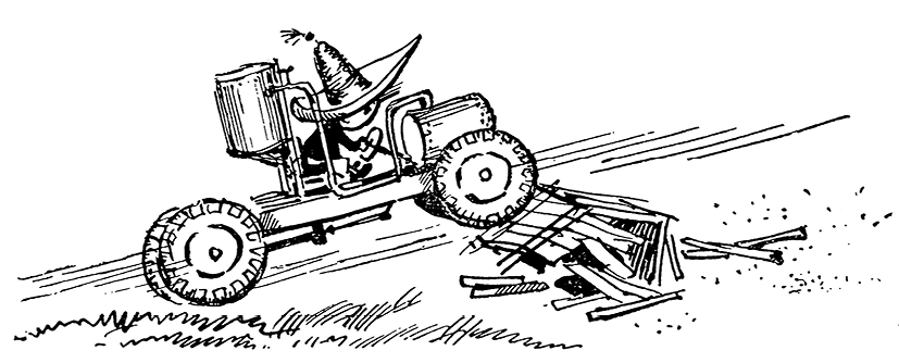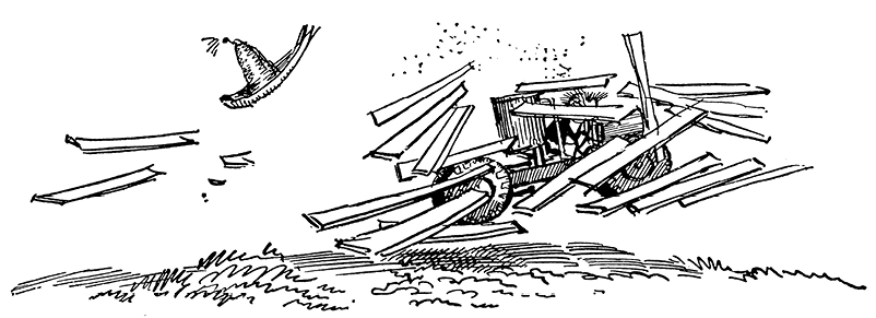 Незнайка испугался, хотел остановить машину и потянул какой-то рычаг. Но машина, вместо того чтобы остановиться, поехала ещё быстрей. На дороге попалась беседка. Трах-та-ра-рах! Беседка рассыпалась на кусочки. Незнайку с ног до головы забросало щепками. Одной доской его зацепило по спине, другой треснуло по затылку. Незнайка ухватился за руль и давай поворачивать. Автомобиль носится по двору, а Незнайка кричит во всё горло: