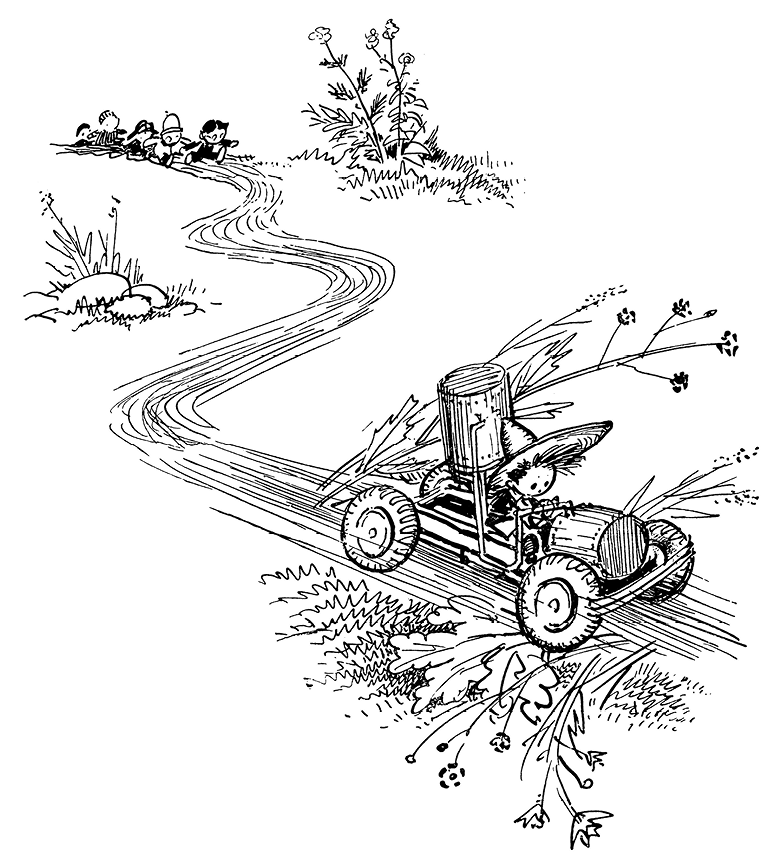 – Берегись! – кричал им Незнайка и мчался вперёд.