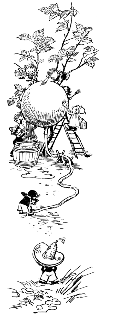 Но шар не лопался, а с каждой минутой становился всё больше и больше. Скоро он раздулся такой большой, что малышам приходилось взбираться на ореховый куст, который рос посреди двора, чтобы обмазывать шар сверху и по бокам.