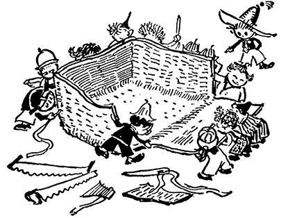 В это время Знайка велел коротышкам наполнить несколько мешков песком и положить их в корзину. Сейчас же Торопыжка, Молчун, Авоська и другие малыши начали насыпать в мешки песок и класть их в корзину.