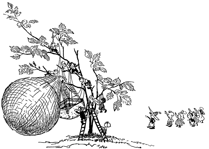 Знайка велел подцепить шар верёвкой снизу, привязать к ветке орехового куста и подтянуть кверху. Сейчас же Торопыжка и Шпунтик взобрались с верёвкой на куст и стали подтягивать шар кверху. Это очень обрадовало зрителей.