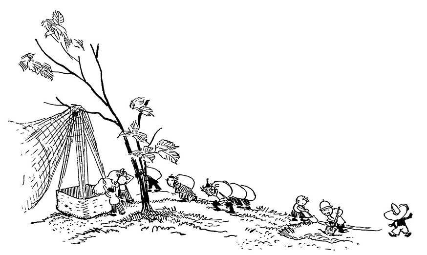 Он привязал шар верёвкой к ореховому кусту, чтобы не унесло ветром, после чего поделил малышей на два отряда. Одному отряду он велел собирать шелковичные коконы, чтобы размотать их и наделать шёлковых нитей. Из этих нитей он велел им сплести огромную сетку. Другому отряду Знайка велел сделать большую корзину из тонкой берёзовой коры.