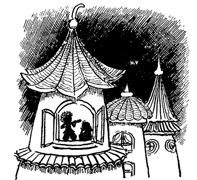 Время от времени они замечали то мелькнувшую в открытом окне аккуратно причёсанную голову Гусли, то взъерошенную шевелюру Тюбика. Потом мельканье голов в окне прекратилось, и малышки увидели Тюбика, который облокотился о подоконник и мечтательно глядел вдаль. Вслед за Тюбиком у окна появился Гусля. Они оба принялись рассуждать о чём-то, посматривая по сторонам и размахивая руками.
