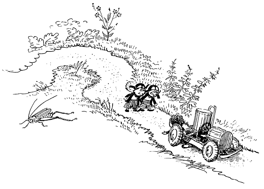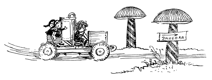 Скоро они вышли из города и зашагали по дороге. Не прошло и часа, как вдали уже завиднелся город Змеевка. Как раз в это время Винтик и Шпунтик увидели стоявший посреди дороги автомобиль. Подойдя ближе, они заметили под машиной коротышку. Голова и грудь его скрывались под кузовом, наружу торчали только ноги в чёрных засаленных брюках.