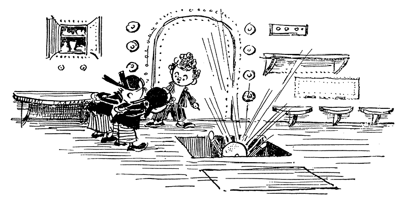 Шурупчик ходил по комнате и нажимал разные кнопки. В результате откидывались новые столы, стулья и полки, открывались дверцы различных шкафов и кладовушек. Наконец он нажал ещё одну кнопку и провалился в подполье.