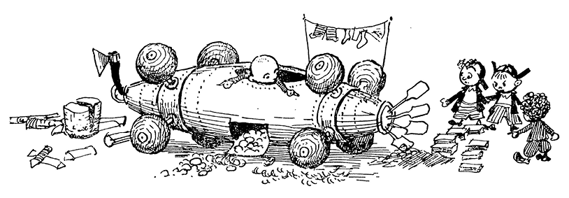– Это восьмиколёсный паровой автомобиль с фисташковым охлаждением, – объяснил Шурупчик. – Четыре колеса у него снизу и четыре сверху. Обычно машина ходит на нижних колёсах; верхние колёса сделаны на тот случай, если машина перевернётся. Все восемь колёс машины поставлены под углом, то есть наклонно, благодаря чему автомобиль может ездить, не только как все автомобили ездят, но и на боку и даже на спине, то есть совсем вверх ногами. Таким образом предотвращается возможность всяких аварий.