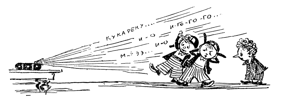 Смекайло повертел какой-то диск, имевшийся под крышкой чемодана, и нажал кнопку. Послышалось шипение, раздался удар, словно захлопнулась дверь. Стало на минуту тихо, потом вдруг раздался дружный смех. Кто-то сказал: «Под столом». Послышалась возня. Снова раздался смех. Кто-то закукарекал, кто-то замяукал, залаял. Потом кто-то заблеял овцой. Кто-то сказал: «Пустите меня, я покричу ослом. – И начал кричать: – И-о! И-о!..» А теперь жеребёнком: «И-го-го-го!» Снова раздался смех.