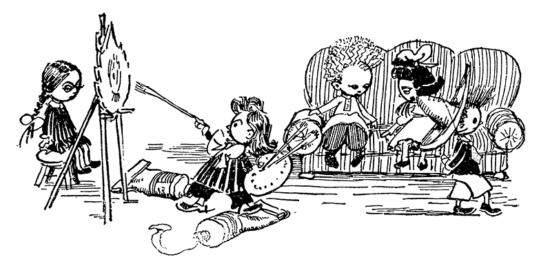 В это время в комнату впорхнула ещё одна малышка и, воспользовавшись общей суматохой, проскользнула прямо к лестнице, которая вела наверх. Увидев это, Незнайка ринулся за ней и уже хотел грубо схватить её за руку, но она остановилась и, надменно взглянув на него, решительно помахала перед его носом пальцем: