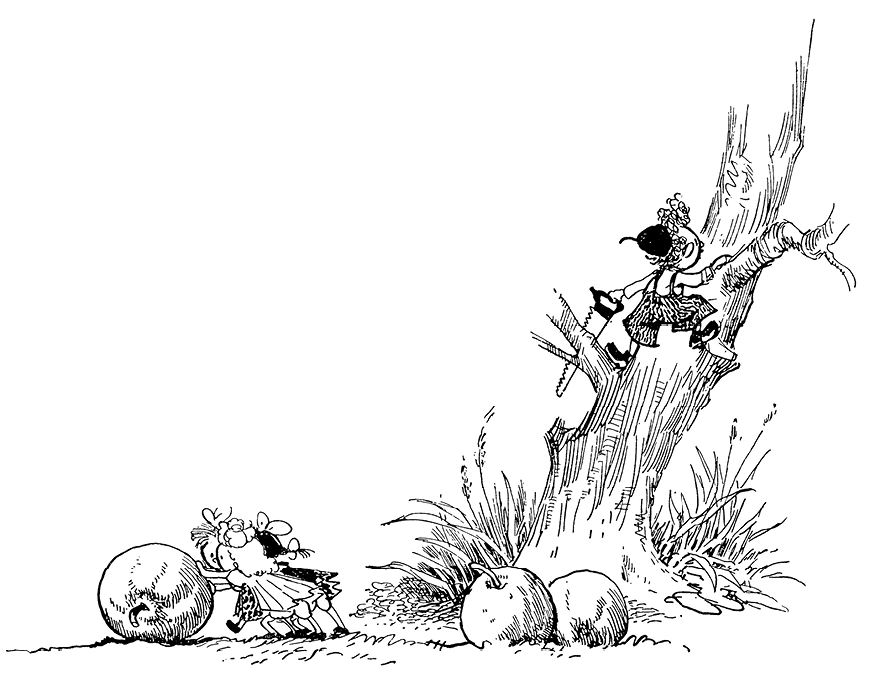Синеглазка сбегала в соседний дом и принесла Торопыжке пилу. Через минуту черенок был перепилен, и яблоко полетело вниз.