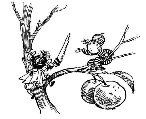 Работа закипела. Прибежала Стрекоза. Она раздобыла где-то пилу, надела вместо платья шаровары, которые надевала для игры в волейбол, и тоже полезла на дерево. Увидев в руках у неё пилу, Авоська сказал: