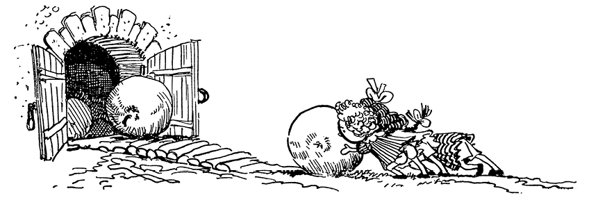 В Зелёном городе под каждым домом имелся подвал для хранения фруктов и овощей. Подкатив яблоко к дому, малышки открыли дверь, которая была сделана вровень с землёй, и вкатили в эту дверь яблоко. За дверью были мостки из досок, по которым яблоко само собой покатилось в подвал. Сделав это, малышки побежали назад, а навстречу им другие малышки катили новое яблоко.