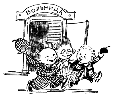 Таким образом, Синеглазка добилась, чтобы, кроме Небоськи и Растеряйки, из больницы выписали Молчуна, Пончика и Сиропчика. В больнице остались Пулька, Ворчун и Пилюлькин. Пулька молча терпел такую несправедливость, так как нога у него всё ещё болела, но Ворчун и Пилюлькин готовы были рвать на себе волосы от досады и сказали, что если к вечеру их не выпишут, то они устроят побег.