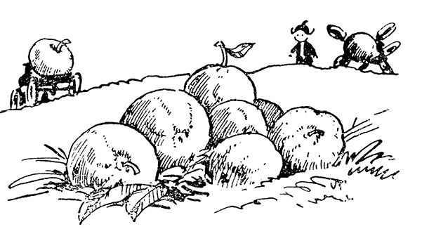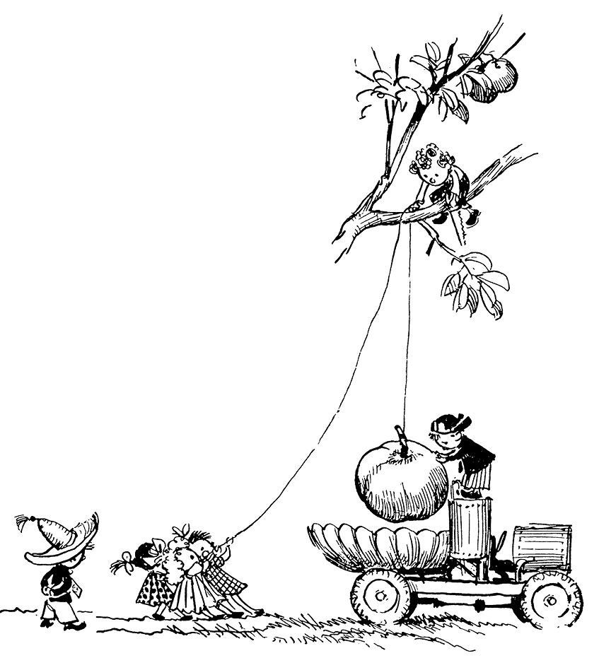Механизация значительно облегчила труд, и работа пошла быстрее. Обе машины шмыгали туда и сюда, развозя по подвалам фрукты. Яблоки и груши возили по одной штучке, а сливы – сразу по пять. Благодаря механизации многие малышки освободились от работы, но, вместо того чтобы сидеть сложа руки, они устроили на улице две палатки. В одну палатку принесли газированной воды с сиропом, в другую наносили пирогов, всяких коржиков, кренделей и конфет. Теперь каждый из работавших мог закусить или попить водички в свободную минутку.