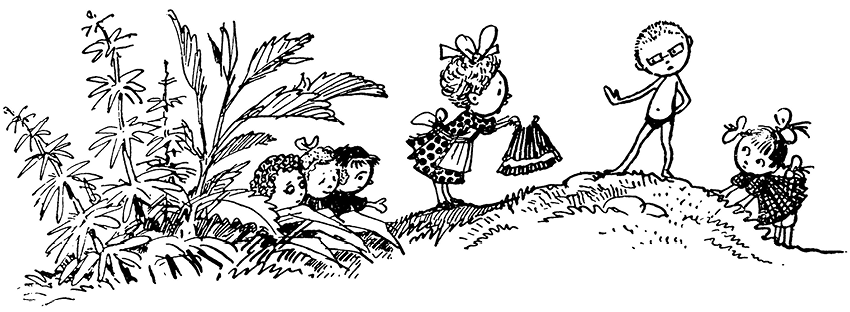 Медуница ещё долго разыскивала Ворчуна с похищенной им одеждой, и, пока шли поиски, Ворчун сидел, притаившись, в зарослях лопуха.
