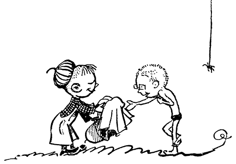 Малышки быстро принесли верёвку. Незнайка взял её и принялся вертеть в руках. Он не знал, как обращаться с верёвкой, и с недоумением смотрел на неё. Потом он сделал вид, будто до чего-то додумался, протянул верёвку Винтику и сказал: