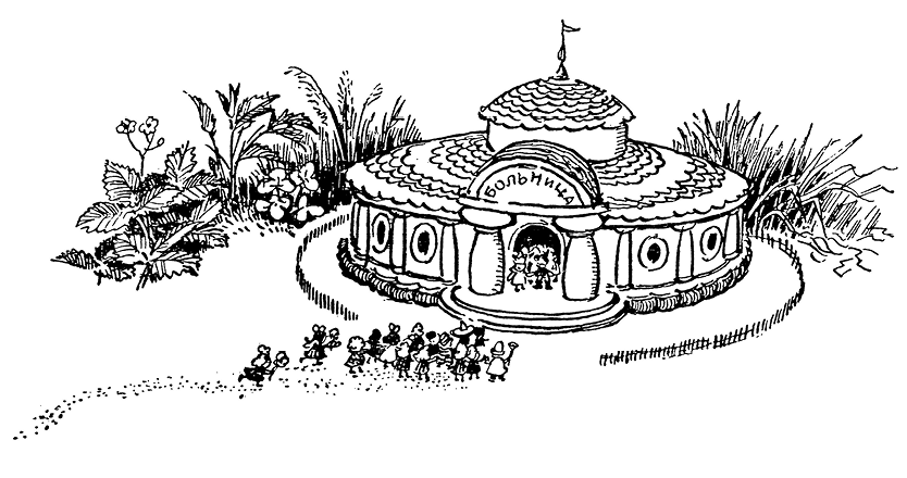 Наконец Ворчун увидел, что Медуница скрылась в больнице. Тогда он потихоньку вылез из своей засады, разыскал Пилюлькина и отдал ему одежду.