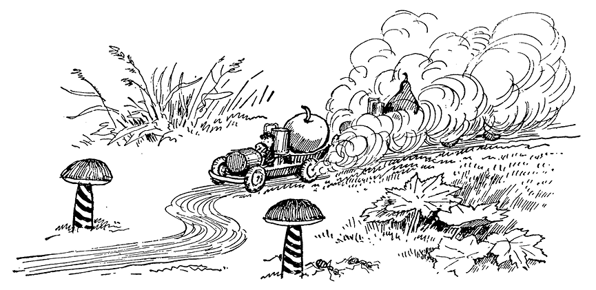 Скоро все увидели, что к городу приближаются один за другим три автомобиля. Это они подняли пыль на дороге. На первой машине лежало большое краснобокое яблоко, на второй – спелая груша, на третьей машине помещалось с полдесятка слив. Поравнявшись со Знайкой, машины остановились, и из них вылезли Бублик, Шурупчик и Гвоздик. Увидев это, коротышки выбежали из домов, стали обнимать Бублика и Шурупчика и даже Гвоздика. Все расспрашивали про дракона, а когда услышали, что никакого дракона нет и никогда не было, то страшно удивились.