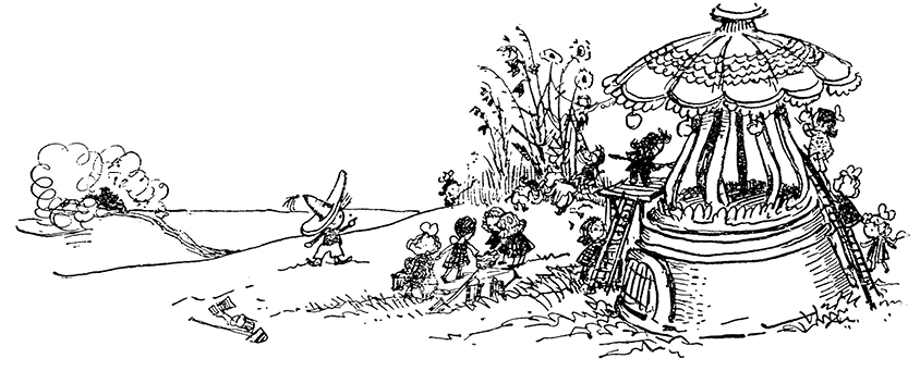 Работа по подготовке к балу была в полном разгаре. Беседка для оркестра и палатки вокруг танцевальной площадки уже были построены. Тюбик расписывал беседку самыми затейливыми узорами, а остальные малыши окрашивали палатки во все цвета радуги. Малышки украшали площадку цветами, разноцветными фонариками и флажками. Незнайка носился туда и сюда и распоряжался изо всех сил. Ему казалось, что работа идёт очень медленно. Он кричал, суетился и только другим мешал. К счастью, каждый и без него знал, что нужно делать.