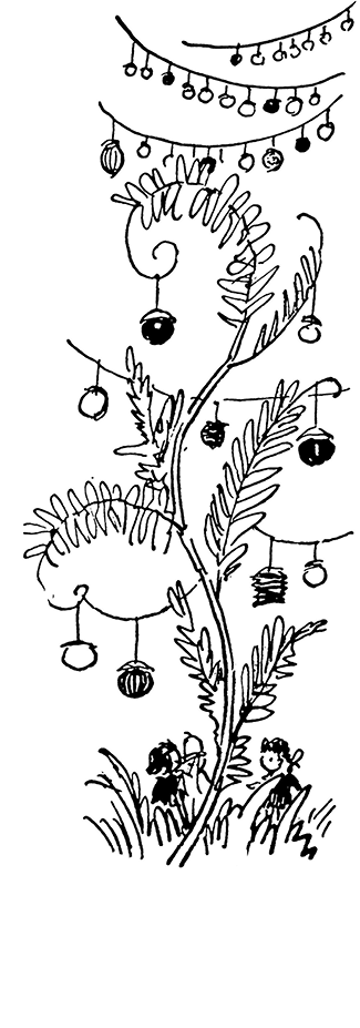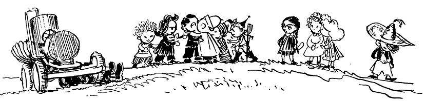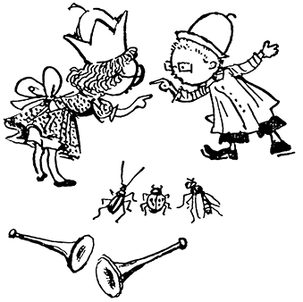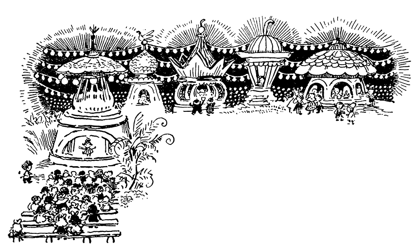 На втором этаже беседки, которая была украшена цветами, помещался оркестр из десяти малышек. Каждая малышка играла на арфе. Здесь были совсем маленькие арфы, которые нужно было держать в руках; были арфы побольше, которые держали на коленях; были также большие арфы, которые стояли на полу, а одна арфа была огромная: чтобы играть на ней, нужно было взбираться на лесенку.