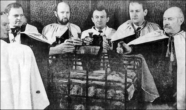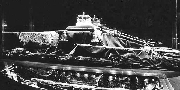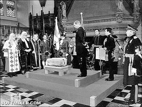 На рис. 31 показана подготовка к переносу Камня Судьбы. На рис. 32 мы видим переноску Камня Судьбы, положенного на полотнище. Рис. 33 показывает Камень Судьбы, огражденный защитной металлической решеткой. На рис. 34 хорошо видно, что при естественном освещении Камень Судьбы весьма светлый, практически белый. На рис. 35 и 36 мы видим очередной ритуал около Камня Судьбы. На рис. 37 снова видно, что Камень Судьбы – светлый. Так что цвет Камня на фотографиях зависит от освещения. На рис. 38 представлены святыни английского двора – Камень Судьбы и корона Эдуарда.