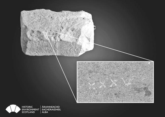 Рис. 38-2. В небольшом углублении на грани Камня Судьбы, на дне выщербины, видны четыре мелкие римские цифры XXXV и еще какой-то туманный росчерк справа. Но, скорее всего, эти маленькие циферки были процарапаны не так давно и вряд ли были на Камне изначально. Может быть, это поздний инвентарный номер хранения. Взято из Интернета