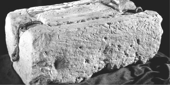 Рис. 38-3. На одной из боковых граней Камня Судьбы видно несколько аккуратных отверстий и вверху вроде бы следы орнамента. Может быть, здесь была какая-то табличка, прикрепленная болтами к Камню. Табличка исчезла, а отверстия для болтов остались. Взято из Интернета
