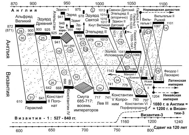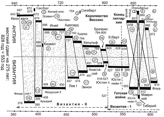 Рис. 39. Династическое соответствие между английскими королями и императорами Византии при жестком хронологическом сдвиге на 275 лет. Начало обнаруженного нами параллелизма
