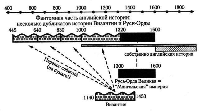 Рис. 43. Общая схема нашей реконструкции английской истории. Письменная история Англии начинается с нескольких дубликатов истории Ромеи-«Византии». События собственно английской истории, происходившие на острове Англия, становятся нам частично известными лишь начиная с XIV века. Возможно, кое-что сохранилось и от XI–XIII веков. Но таких сведений очень мало