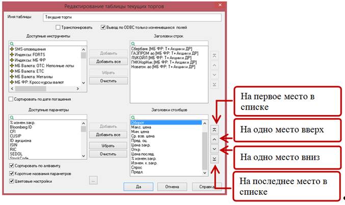 Для удобства анализа параметров «Таблицы текущих торгов» в дальнейшем, расположите все добавленные в таблицу параметры в той очередности, в которой они представлены в этом списке. Используйте для этого кнопки со стрелками справа от списка «Заголовки столбцов» (рис. 2.17).